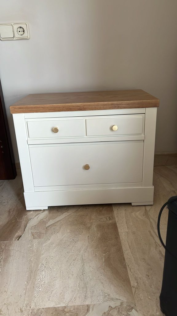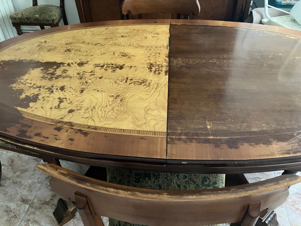 La mesa y las sillas originales, con su acabado en madera rojiza brillante y tapizado azul, tenían un estilo clásico que ya no encajaba con la decoración actual. Hemos renovado totalmente el conjunto manteniendo su excelente calidad y estructura original. La mesa se barnizó en un tono madera clara mate, resaltando la preciosa incrustación central […]
